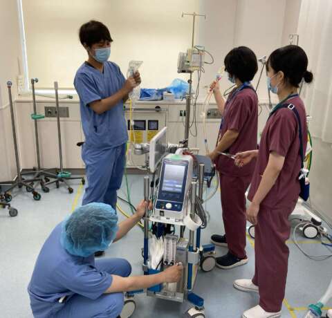当院は、高度急性期病院であることから、重症患者に対するV-A V-VECMO/PCPSの補助循環装置を使用した治療が増加しており、これらの装置を使用した治療は、導入から離脱までに多くの対応が必要になっています。そのため、医師と看護師、臨床工学士等の多職種連携によるチーム医療の向上を目的に、院内・院外で研修会が実施されています。