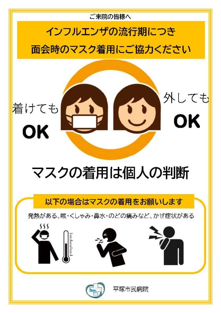 これまで新型コロナウイルス感染症の流行開始により、職員及び患者さんへマスクの着用をお願いしてきましたが、昨今の感染状況を鑑みて、当院では令和7年7月1日以降、病院内でのマスクの着用は個人の判断といたします。